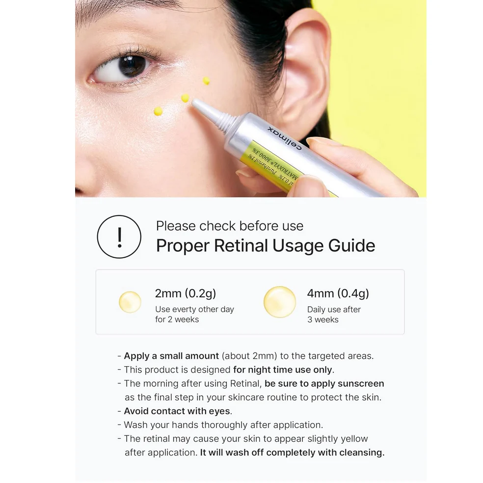 Tähelepanu! Kui te pole varem retinooli kasutanud, alustage kasutamist järk-järgult: näiteks 2 korda nädalas 2 nädala jooksul.